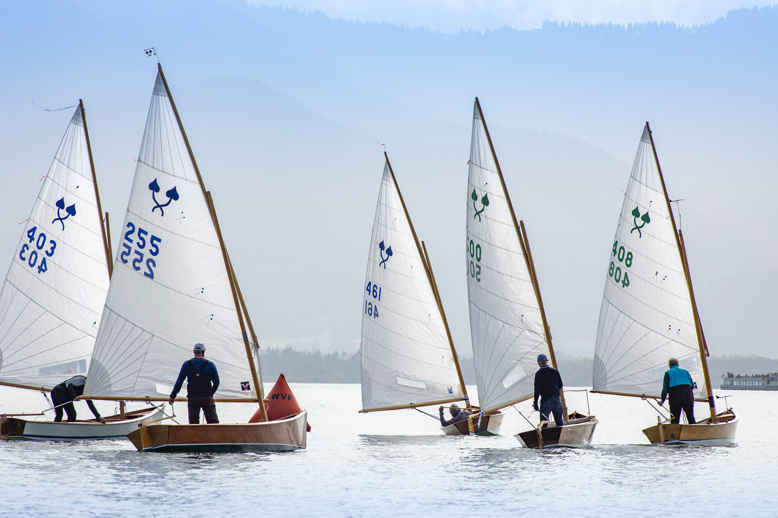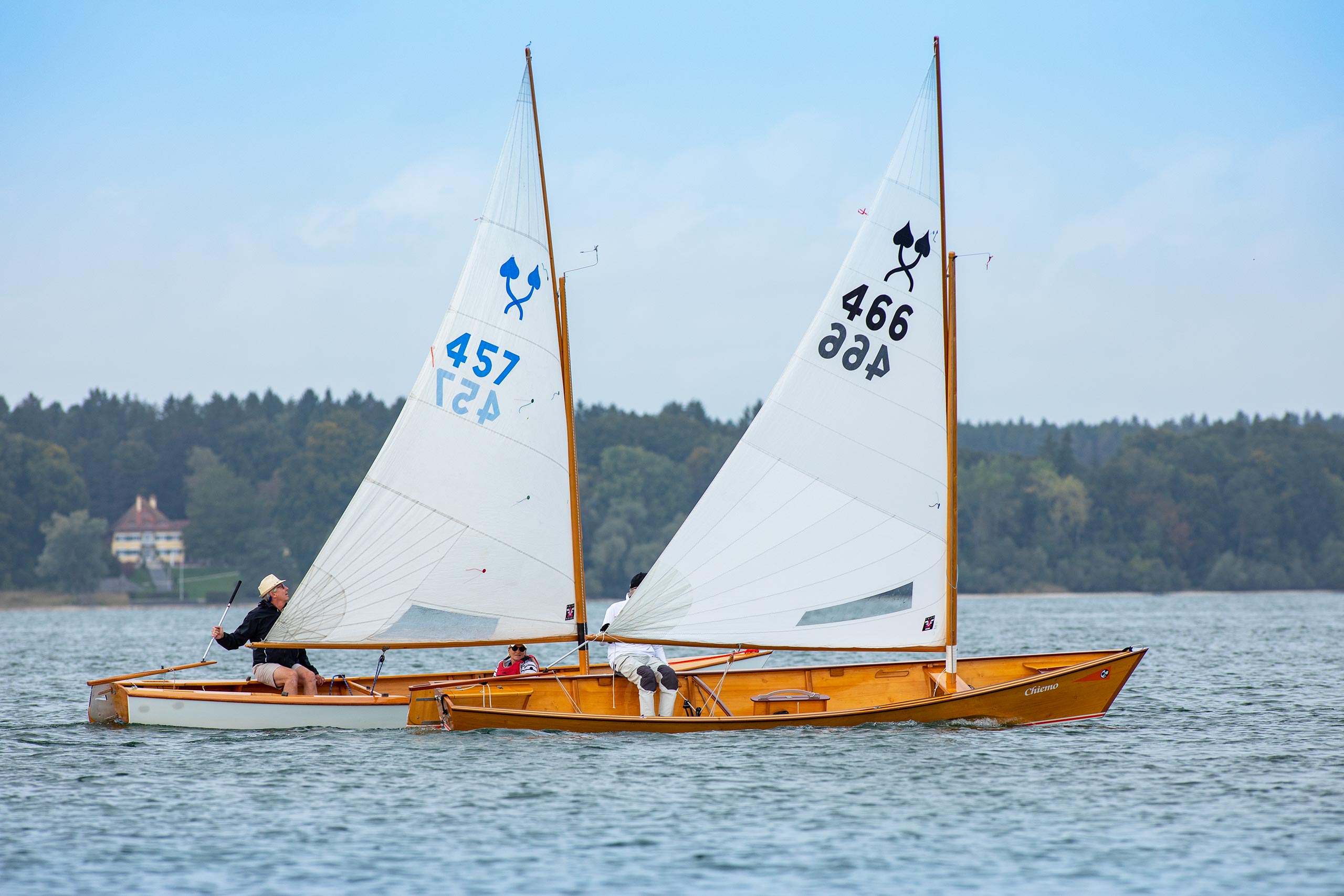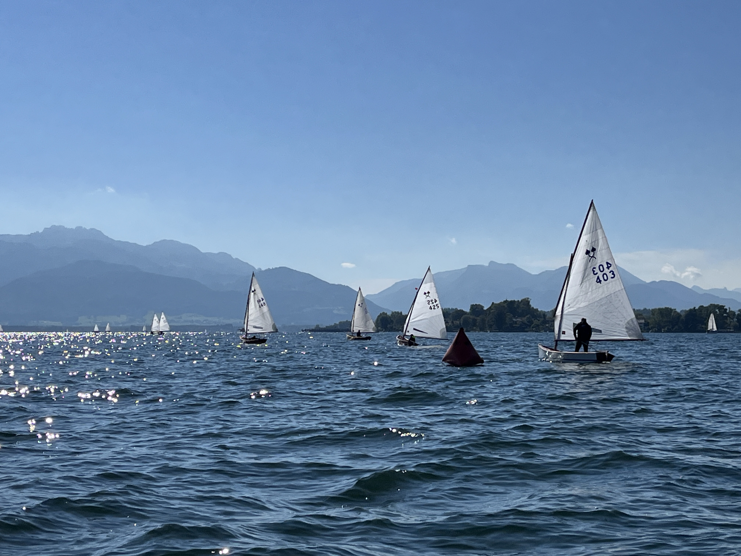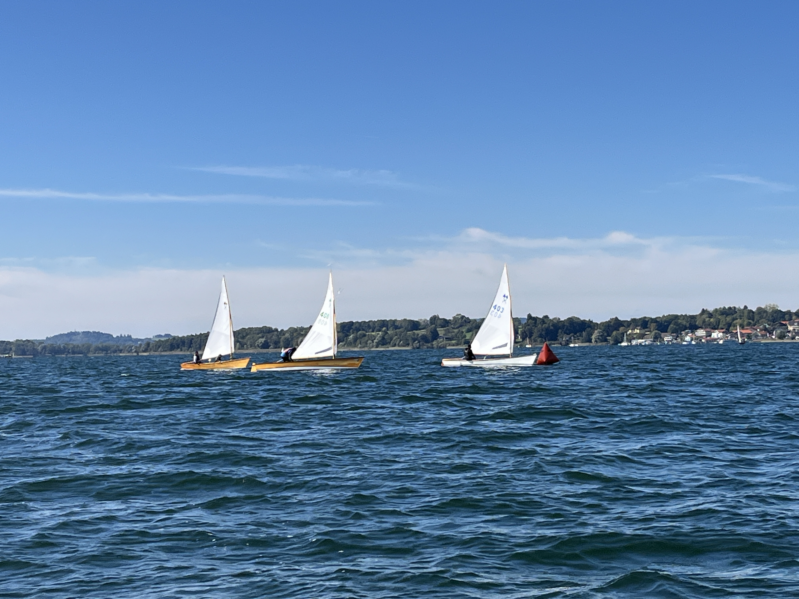 Der stabile Wind ließ sofort eine zweite Wettfahrt zu, die diesmal von Matthias Gebauer vor Gerald Metz (WVF) und Cornelia Stapff (YCU) gewonnen wurde. Die ambitionierte Wettfahrtleitung schickte die Schiffe mit einem dritten Start nach 16 Uhr noch einmal auf den mittlerweile leicht verkürzten Kurs. Mit wieder einem Einzelrückruf beim Start glitten die Traditionsklassiker noch ein drittes und letztes Mal in der Spätnachmittgssonne über den goldglitzernden See gen Herrenchiemsee. Wieder lohnte sich die inselnahe Taktik bei nun kontinuierlich abflauendem Wind. Mit Flagge Sierra verkürzt endete in der zweiten Runde an der Luvtonne die letzte Wettfahrt. Diesmal mit Gerald Metz an der Spitze dicht gefolgt von Matthias Gebauer und Peter Heistracher an dritter Position.