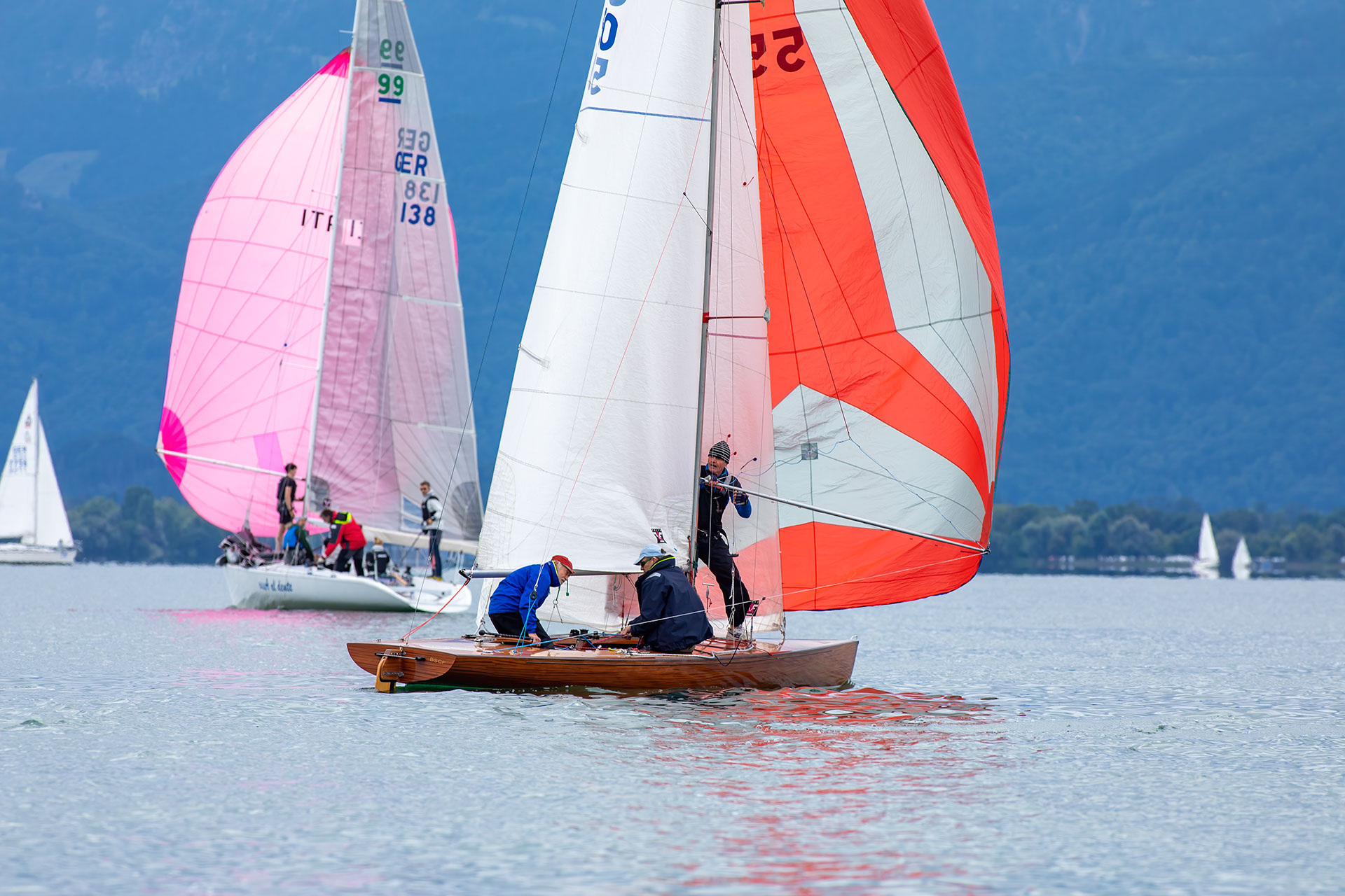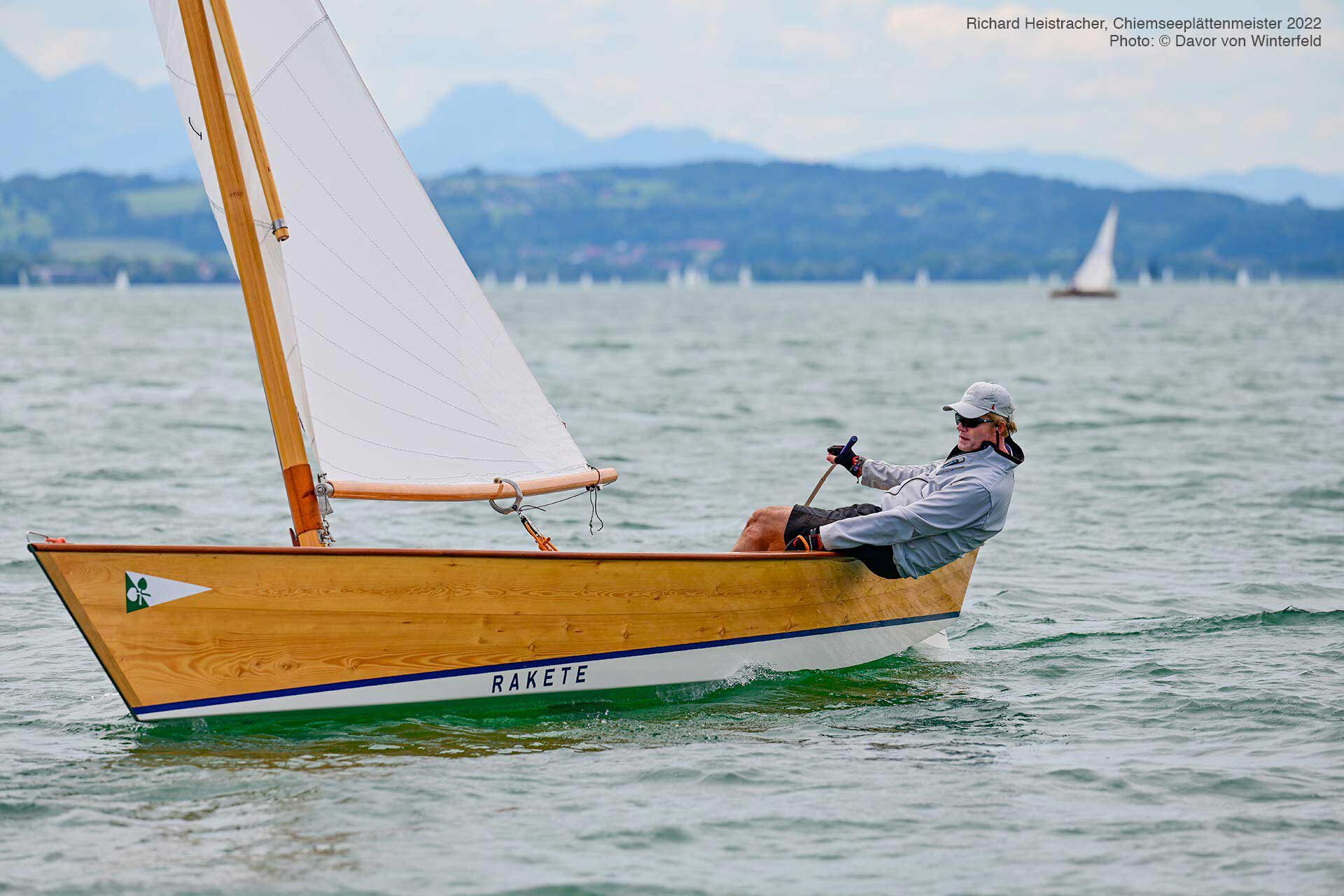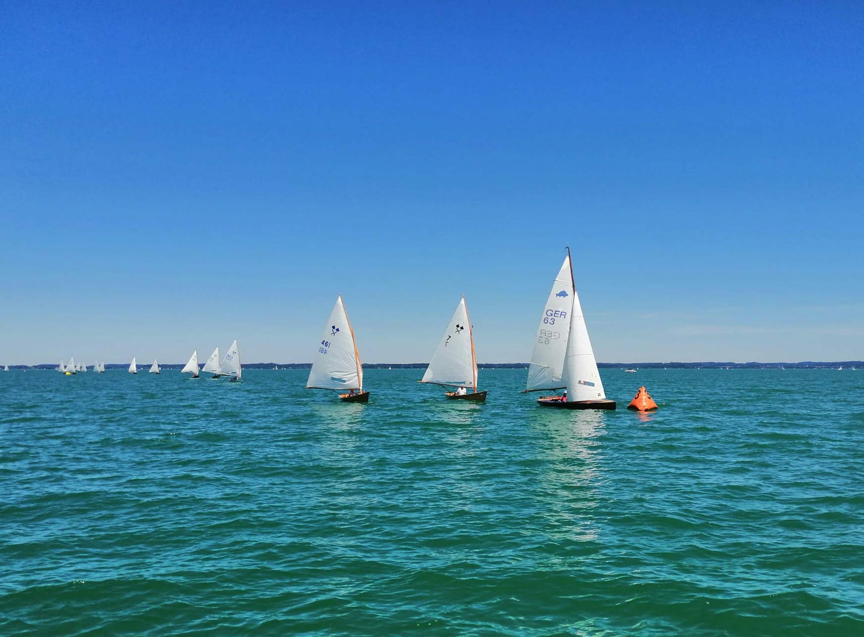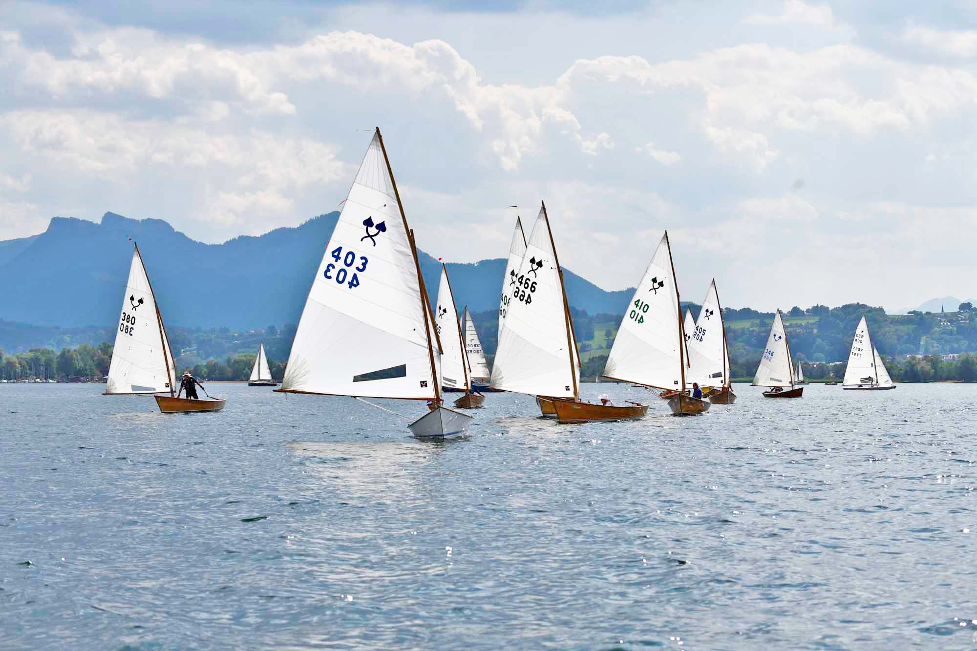Der stabile Wind ließ sofort eine zweite Wettfahrt zu, die diesmal von Matthias Gebauer vor Gerald Metz (WVF) und Cornelia Stapff (YCU) gewonnen wurde. Die ambitionierte Wettfahrtleitung schickte die Schiffe mit einem dritten Start nach 16 Uhr noch einmal auf den mittlerweile leicht verkürzten Kurs. Mit wieder einem Einzelrückruf beim Start glitten die Traditionsklassiker noch ein drittes und letztes Mal in der Spätnachmittgssonne über den goldglitzernden See gen Herrenchiemsee. Wieder lohnte sich die inselnahe Taktik bei nun kontinuierlich abflauendem Wind. Mit Flagge Sierra verkürzt endete in der zweiten Runde an der Luvtonne die letzte Wettfahrt. Diesmal mit Gerald Metz an der Spitze dicht gefolgt von Matthias Gebauer und Peter Heistracher an dritter Position.