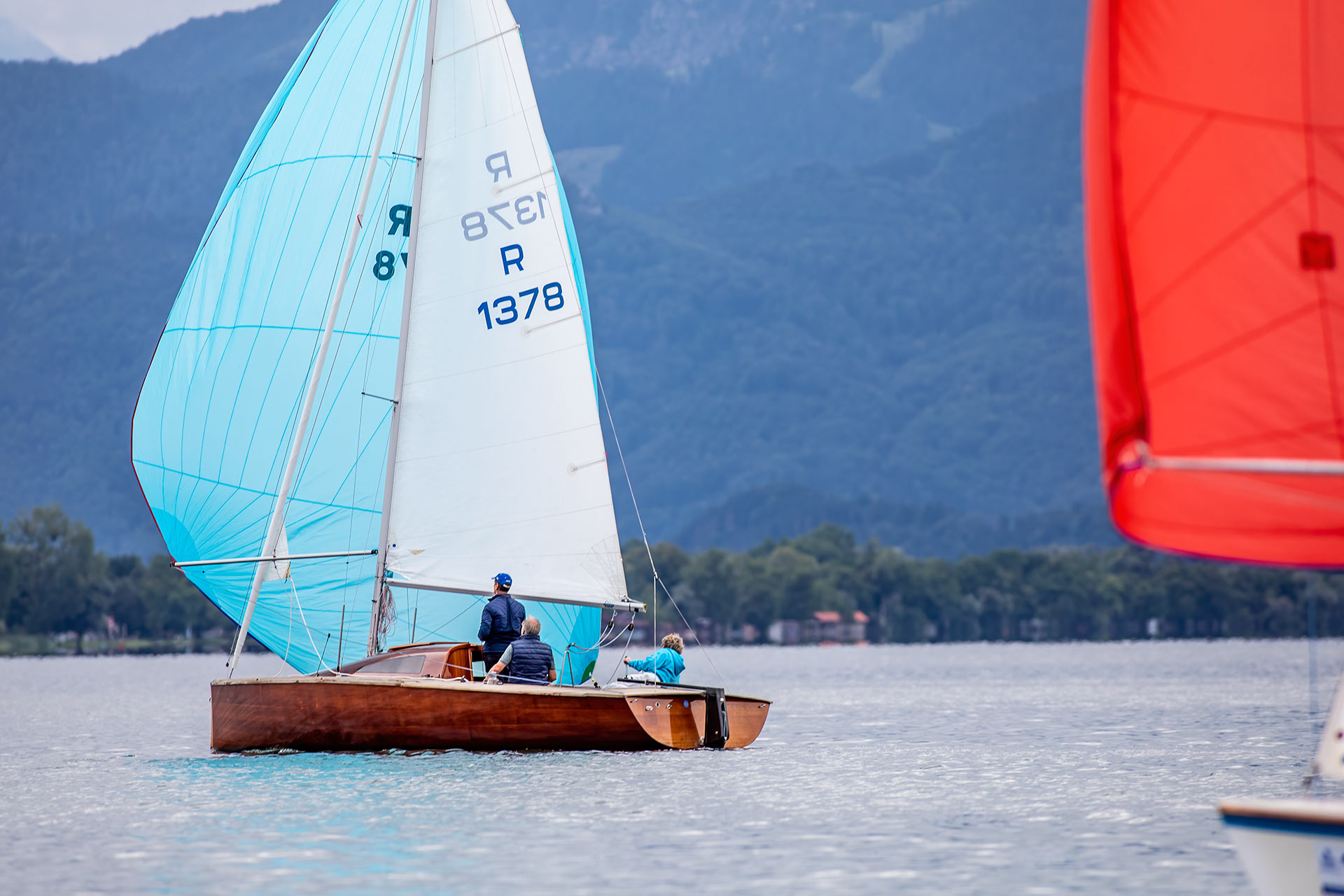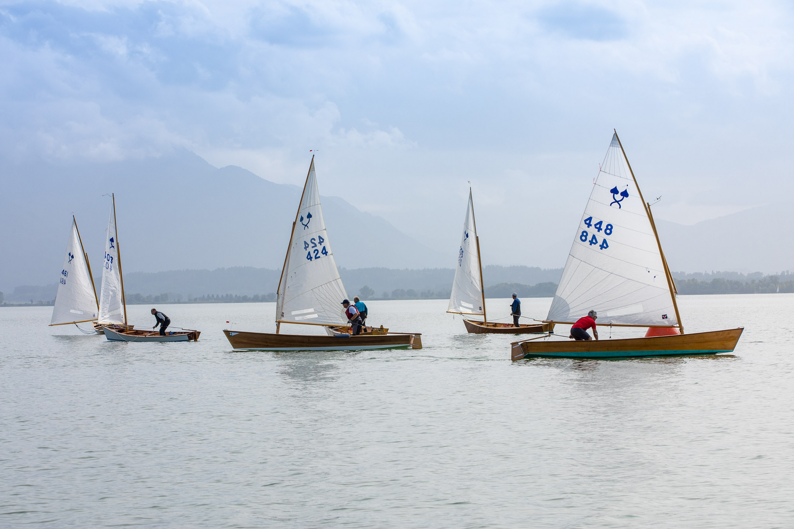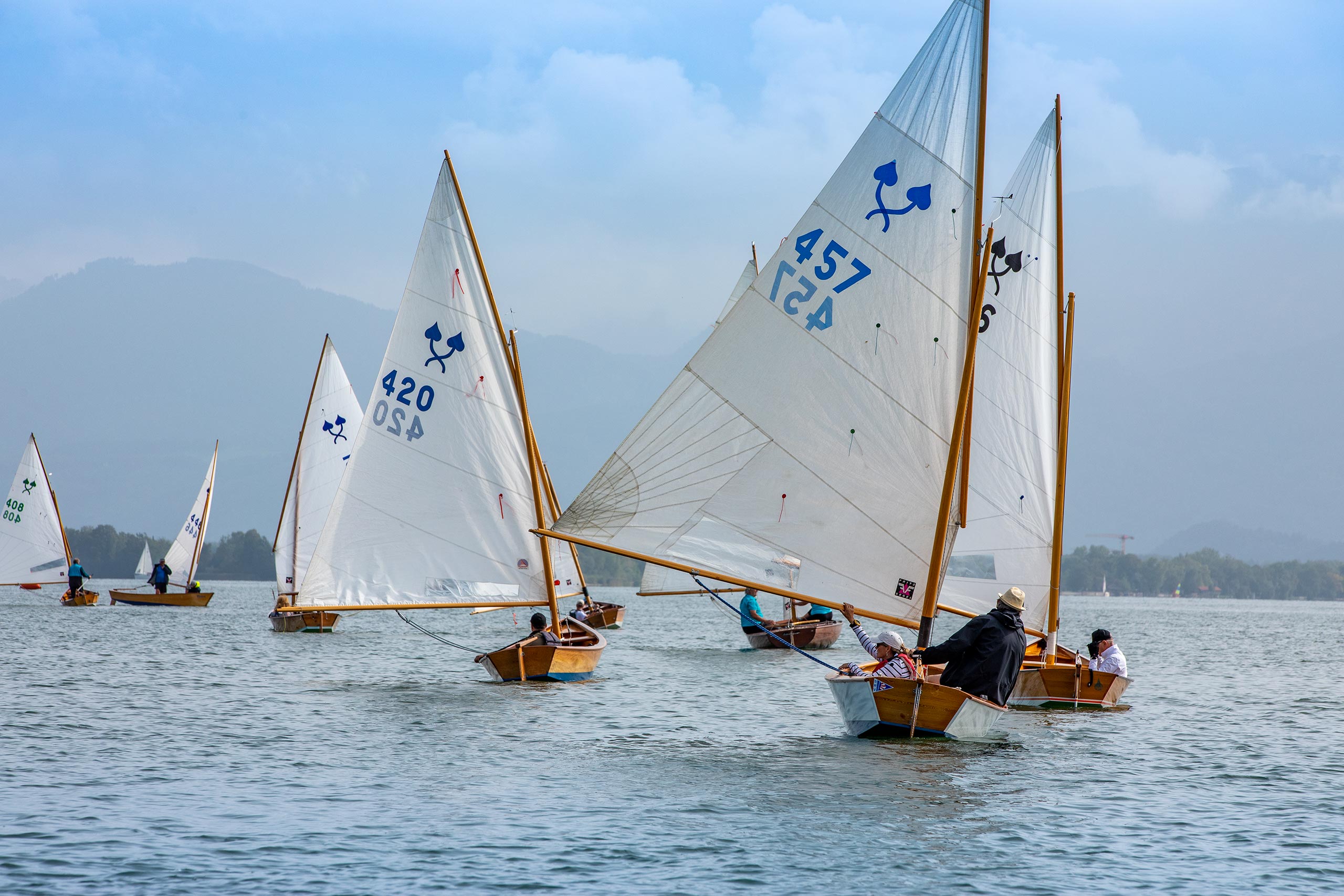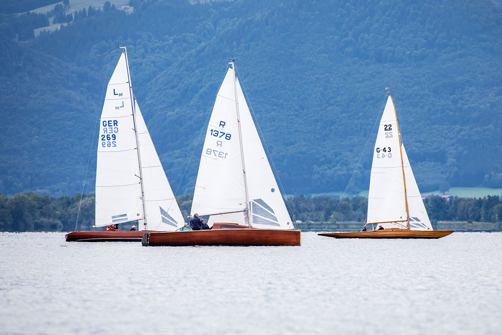Der stabile Wind ließ sofort eine zweite Wettfahrt zu, die diesmal von Matthias Gebauer vor Gerald Metz (WVF) und Cornelia Stapff (YCU) gewonnen wurde. Die ambitionierte Wettfahrtleitung schickte die Schiffe mit einem dritten Start nach 16 Uhr noch einmal auf den mittlerweile leicht verkürzten Kurs. Mit wieder einem Einzelrückruf beim Start glitten die Traditionsklassiker noch ein drittes und letztes Mal in der Spätnachmittgssonne über den goldglitzernden See gen Herrenchiemsee. Wieder lohnte sich die inselnahe Taktik bei nun kontinuierlich abflauendem Wind. Mit Flagge Sierra verkürzt endete in der zweiten Runde an der Luvtonne die letzte Wettfahrt. Diesmal mit Gerald Metz an der Spitze dicht gefolgt von Matthias Gebauer und Peter Heistracher an dritter Position.