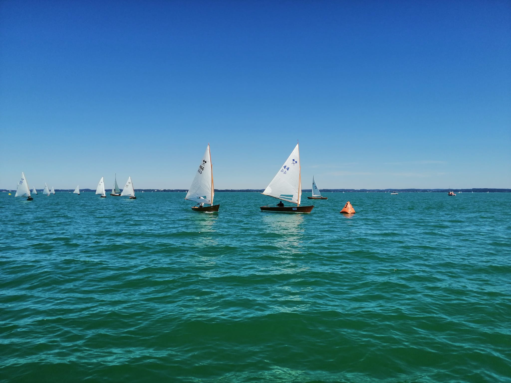 Nach Zieleinlauf des letzten Teilnehmers wurde die 2. Wettfahrt gestartet, der Wind hatte zwischenzeitlich deutlich nachgelassen und auch kurz vor dem Start nach rechts gedreht. Beim Start war deshalb die Seite der Startlinie bevorzugt. Dies nutzten einige Starter, die sich mit einem sehr guten Start für die rechte Seite der Bahn entschieden. Im Verlauf der ersten Kreuzstrecke zeigte sich dann aber, dass die rechte Seite nicht die bevorzugte Bahn war und auch der Wind schwächte sich immer mehr ab. Nach der ersten Runde führte bei den Einheitsplätten Richard Kuchler vor Florian Lex, WV Fraueninsel. Richard Kuchler wählte wieder die rechte Seite der Bahn, während Florian Lex es über die linke Seite versuchte und zeitweise auch an der Spitze des Feldes lag. Nachdem der Wind sich immer mehr abschwächte, entschied sich der Wettfahrtleiter im Verlauf der zweiten Kreuz an der Luvtonne das Ziel aufzubauen. Sieger der 2. Wettfahrt bei den Chiemsee-Einheitsplätten wurde Richard Kuchler vor Florian Lex und Peter Heistracher, WV Fraueninsel.