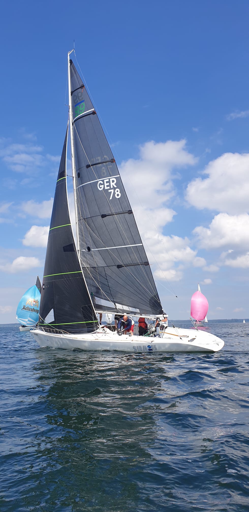 Danach schien es, dass der Wind sein letztes Lüftchen ausgehaucht hatte und mit zunehmender Temperatur endgültig einschlafen würde, so dass sich die Teilnehmer bereits Richtung Hafen orientierten, als völlig unerwartet ein kräftiger Westwind einsetzte.