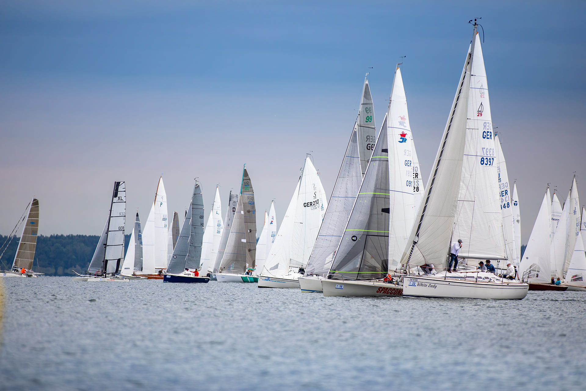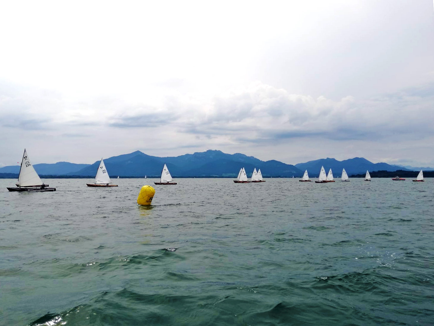 Während der Woche vor der Regatta zeichnete sich bei den Meldungen ein neuer Melderekord ab. Letztlich fanden sich dann 92 Schiffe mit Mannschaft am Samstag früh zum Weißwurst-Frühstück auf der Fraueninsel ein. Angekündigt war leichter Wind aus umlaufenden Richtungen für den ganzen Tag, was für den Segler keine wünschenswerten Bedingungen sind. Nach der Steuermannsbesprechung um 10.00 Uhr hieß es, zügig auszulaufen um das Startgebiet zu erreichen, das auf der anderen Seite der Insel lag. Zwar erreichten die Schiffe dieses Mal großteils rechtzeitig das Startgebiet, trotzdem musste der Wettfahrtleiter Hannes Niggl das Signal für eine Startverschiebung setzen, da an einen Start mit reellen Bedingungen nicht zu denken war. Es ging ein leichter Wind, der aber ständig zwischen Südost und West hin und her schwankte, so dass es nicht möglich war, eine vernünftige Startlinie aufzubauen.