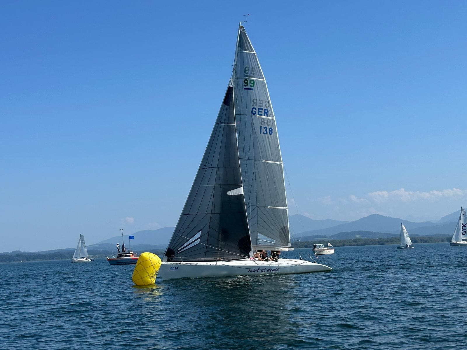 Am zweiten Wettfahrttag zeichnete sich schon bald ein leichter, aber stabiler Wind aus Ost ab, so dass der Wettfahrtleiter Hannes Niggl vom WVF die Schiffe auslaufen ließ. So konnten am zweiten Wettfahrttag dann 3 Regatten gesegelt werden, wobei die Reihenfolge der Zieleinläufe bei den einzelnen Regatten stark durcheinander gewürfelt wurde. Die 1. Wettfahrt gewann SKH Prinz Luitpold von Bayern vom BYC, die 2. Wettfahrt dann Hans-Jürgen Koch mit Familiencrew vom WVF und die 3. Wettfahrt an diesem Tag gewann Christoph Müller vom CYC. Christoph Müller, Asso 99 Europameister, der mit einem Teil der Bundesligamannschaft vom CYC antrat, hatte dann auch die Gesamtführung nach dem 2. Wettfahrttag inne.