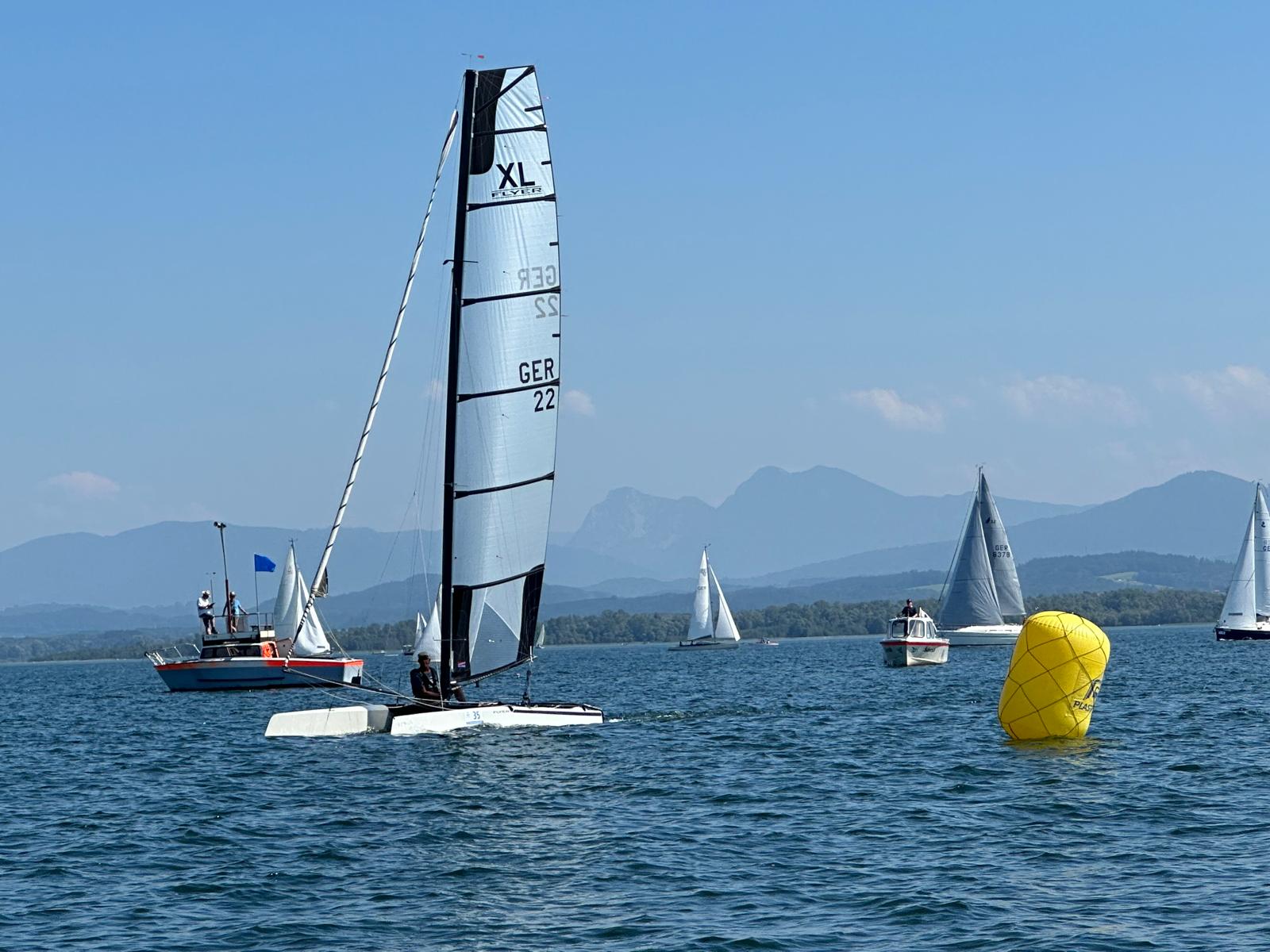 Das Weitsee Rennerts weicht von den anderen Läufen der Chiemsee Meisterschaft ab, da es vom Kurs her der einzige Lauf ist, bei dem ein klassischer Kurs wie bei den Einheits- klassenregatten, nämlich ein Up and Down gesegelt wird. Die Startlinie muss lotrecht zum Wind ausgelegt werden und die Luvtonne genau in Windrichtung. Nach vielen Versuchen, einen Kurs auszulegen, konnte endlich nach fast zwei Stunden des Wartens eine Startlinie aufgebaut und die Wettfahrt gestartet werden. Trotz der sehr unterschiedlichen Schiffe gelang der Start gleich aufs erste Mal, allerdings waren zwei Schiffe zu früh gestartet und mussten deshalb umdrehen bzw. wurden wegen Frühstarts disqualifiziert. Vornweg waren die schnellen Katamarane und die großen Sportyachten. Die ersten Schiffe an der 1. Bahnmarke waren die Catamarane, nämlich Florian Meier/Reinhard Egner auf C-Cat, Thomas Frank auf Flyer XL und Friedl Liese mit seinem Hurricane, erst dann folgten die ersten Einrumpfboote.