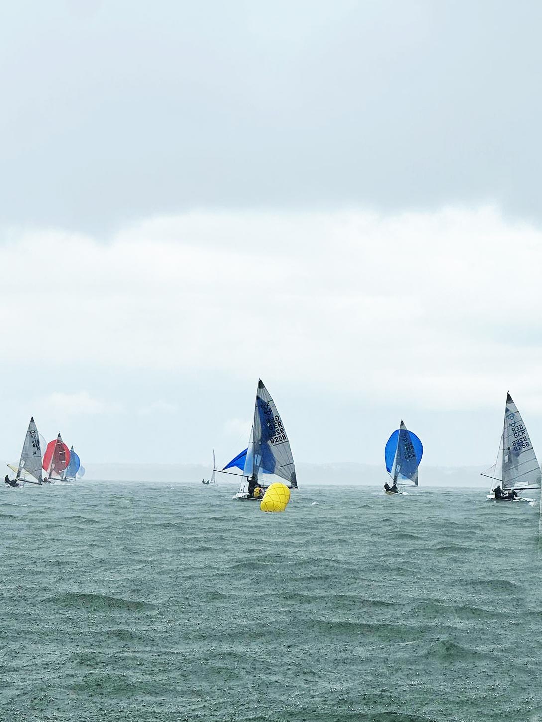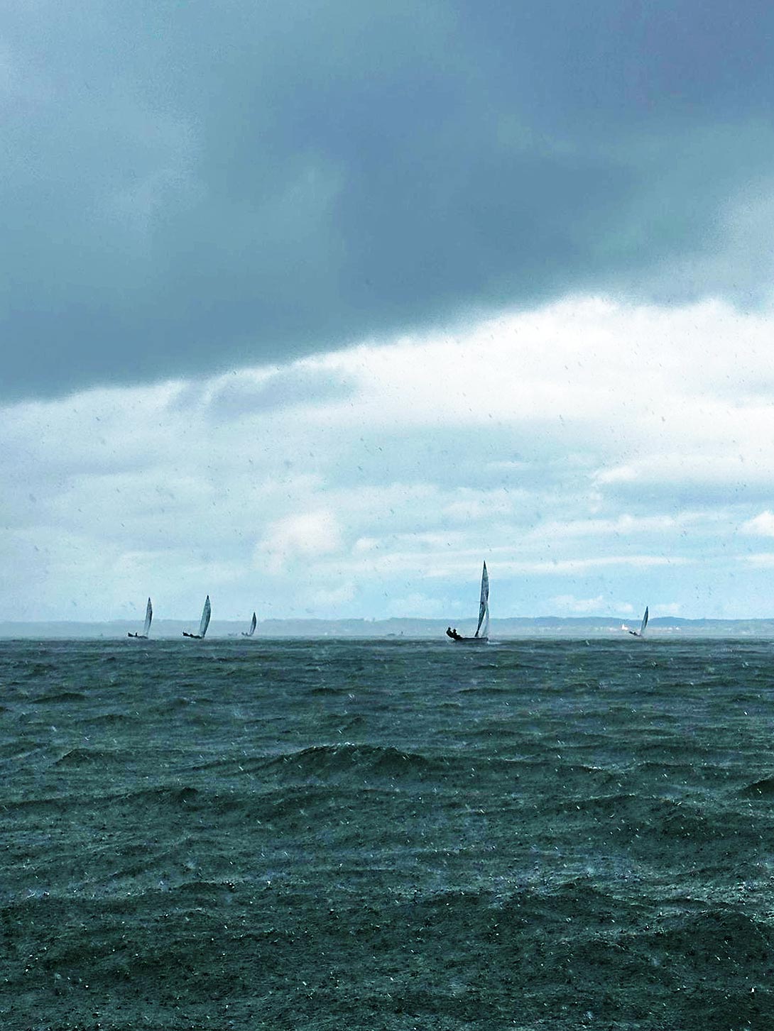 Bild unten: Auf der zweiten Kreuz der 7. Wettfahrt ging eine Gewitterwolke mit kurzzeitigem heftigem Regen durch das Feld, so dass es zu einigen Kenterungen kam.