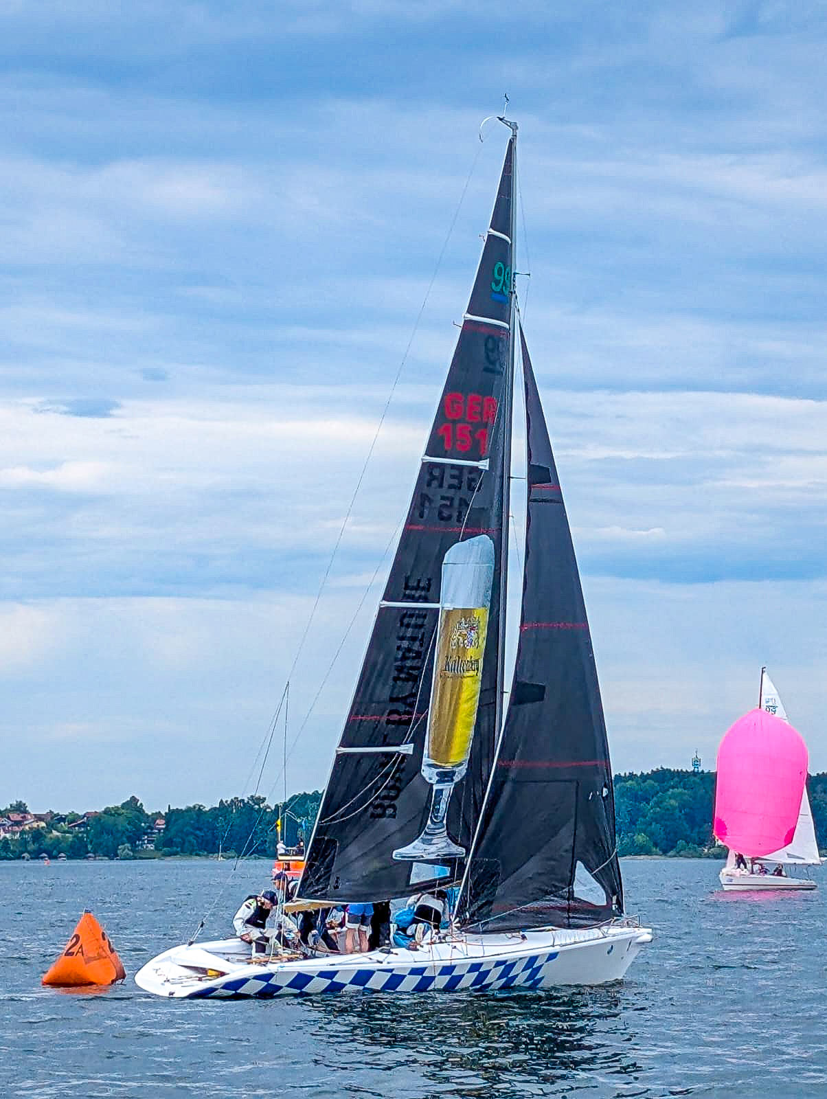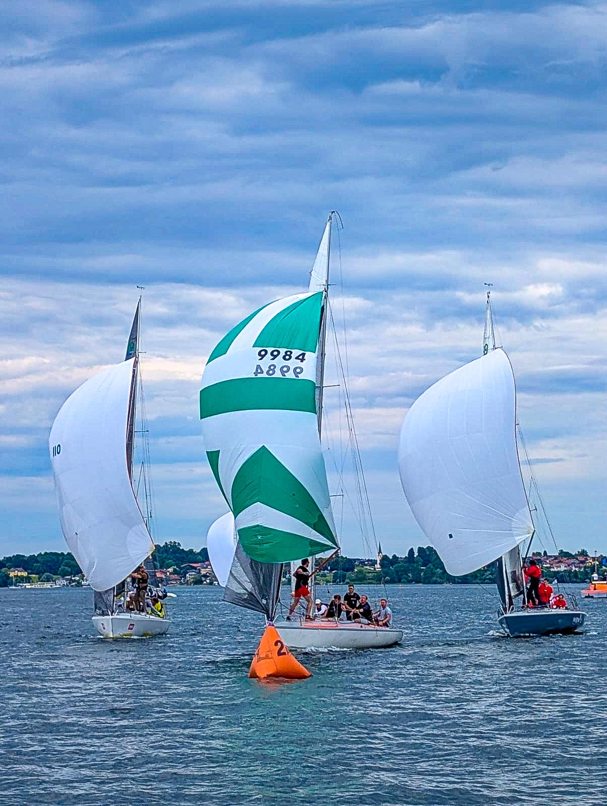 Aber zuerst muss mal gesegelt werden: Charly Zipfer scheuchte uns auf den Vorwindkurs zur Startlinie. Der geplante Up-and-down – Kurs sollte eigentlich das Rennen um den Gesamtsieg noch einmal spannend machen, meint man, denn da sind mehr seglerische Qualitäten gefordert: etwa technisch einwandfreie Wenden oder exakte und vorausschauende Bojenmanöver, anders als auf langen Gennaker- oder Spikursen. Der Wind, der uns seit Seebruck begleitete, bequemte sich nach einem akademischen Viertelstündchen ebenfalls an die Startlinie und los ging’s auf den Kreuzkurs Richtung Fraueninsel. Der Wind hatte offenbar wie die Segler die Frühstückspause genutzt, dabei am Klosterlikör mehr als genippt und konnte sich nicht mehr recht an die Richtung erinnern, aus oder in die er wehen sollte. So folgte auf den ersten Kreuzkurs ein eher halbwindiger Spi- und Gennakerkurs zur Leetonne und aus dem zweiten Kreuzkurs wurde fast ein Anlieger. So viel zum Thema Auslese durch technische Perfektion. Um es kurz zu machen: Der Wind wurde zwar weniger, hielt aber lange genug durch und wirbelte -bildlich- das Feld gründlich durcheinander: