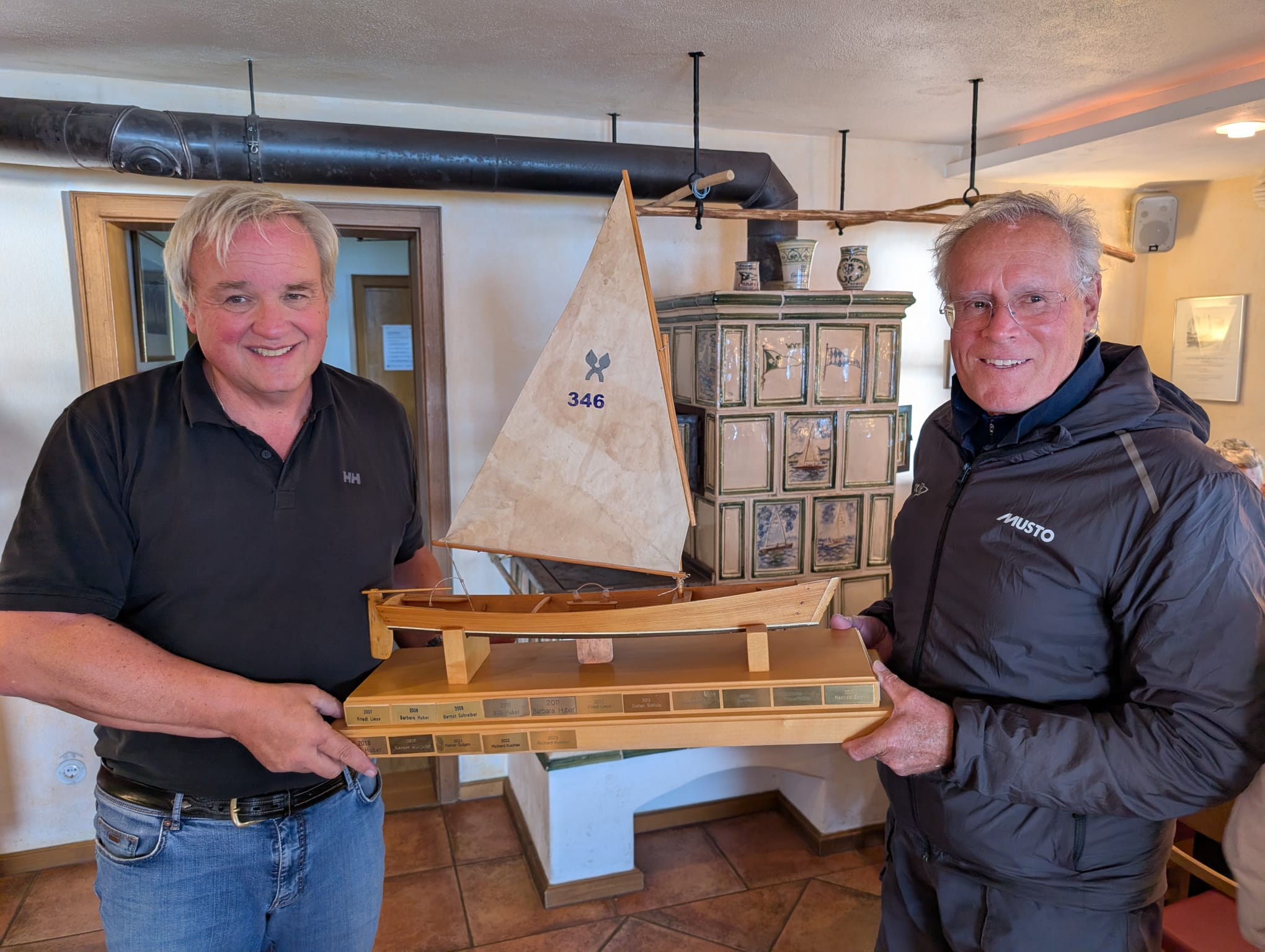 Preisverteilung Lindchen Cup 2025: Links: Charly Zipfer (1. Vorstand WVF), rechts: Richard Kuchler (Gesamtsieger vermessene Plätten),